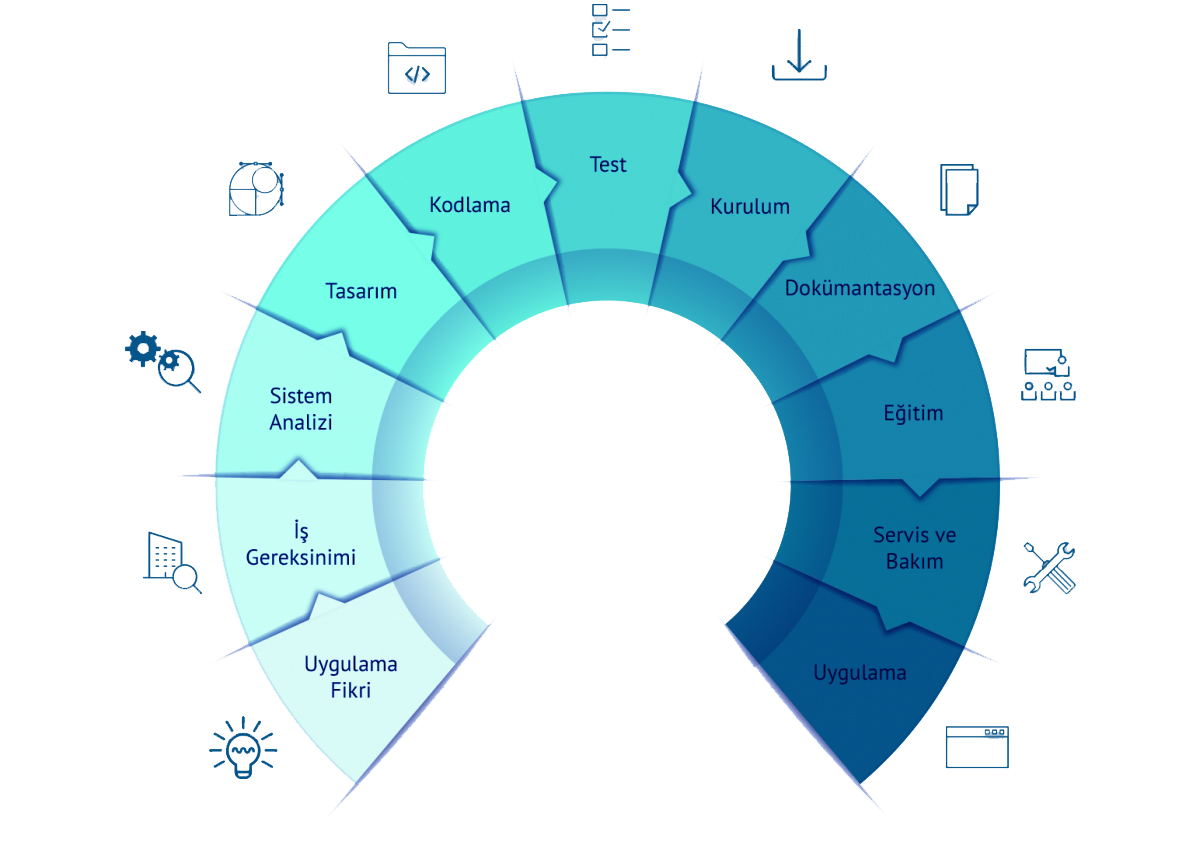 • Kurulumlar: Geliştirdiğimiz projeyi müşterimizin belirlediği ortama kurulur ve projede müşteri tarafından gelecek olan yeni geliştirmeleri not alma